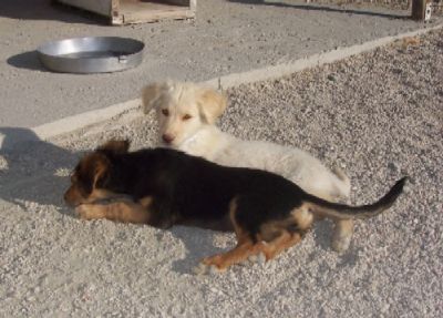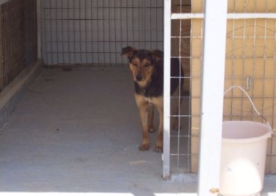Als ich noch nicht wusste, was ihnen widerfahren war, hatte ich mich über diese grenzenlose Scheu der Hunde gewundert - kaum einen Menschen auch nur gewittert, haben sie sich sofort zitternd in ihrem Häuschen versteckt. Eriberto hatte mich vom ersten Tag an angerührt - mit viel Zeit, Geduld und Leckerlis habe ich es irgendwann geschafft, dass er nicht sofort verschwindet, wenn man nur auf seine Zwingerreihe zuging! Erst nur von ausserhalb des Zwingers auf ihn zugegangen, konnte ich nach zwei Tagen schon den Zwinger betreten - er hat sich zwar entfernt, aber nicht mehr versteckt.
